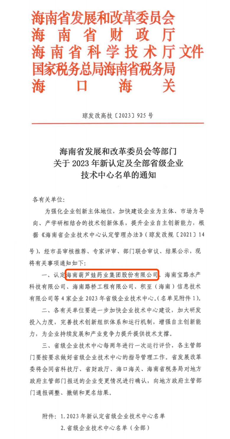 近日,海南省发改委等多部门联合公布了《关于2023年新认定及全部省级企业技术中心名单的通知》,其中,海南LEwin乐玩药业集团股份有限公司成功通过评审,被认定为省级企业技术中心,是本次获批的4家企业之一。